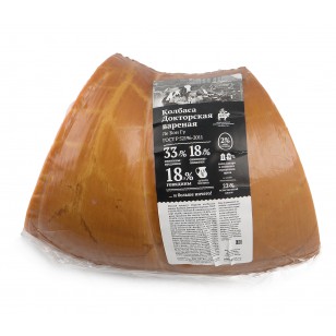 Колбаса Докторская вареная ГОСТ Р 52196-2011. Состав: говядина высший сорт 18,85%, свинина лопатка 18,85%, свинина грудинка без шкуры 33,94%, вода 22,61%, соль поваренная пищевая 0,67 %, нитритная соль 0,9%, сахар-песок 0,15%, фосфат "Абастол 305" 0,22%, молоко сухое цельное 1,51%, яйцо куриное (меланж) 2,26%, орех мускатный молотый 0,04%. Оболочка натуральная - синюга говяжья. Пищевая и энергетическая ценность в 100 г продукта (среднее значение): белки -- 12,0 г, жиры -- 20,0 г, 228 Ккал/954,6 КДж. Хранить не более 15 суток при температуре от +2° до +6° и относительной влажности от 70% до 80%. Продукт охлажденный. Продукт готов к употреблению. Упаковано под вакуумом. После вскрытия упаковки хранить не более 2 суток в пределах срока годности. ЕАС
